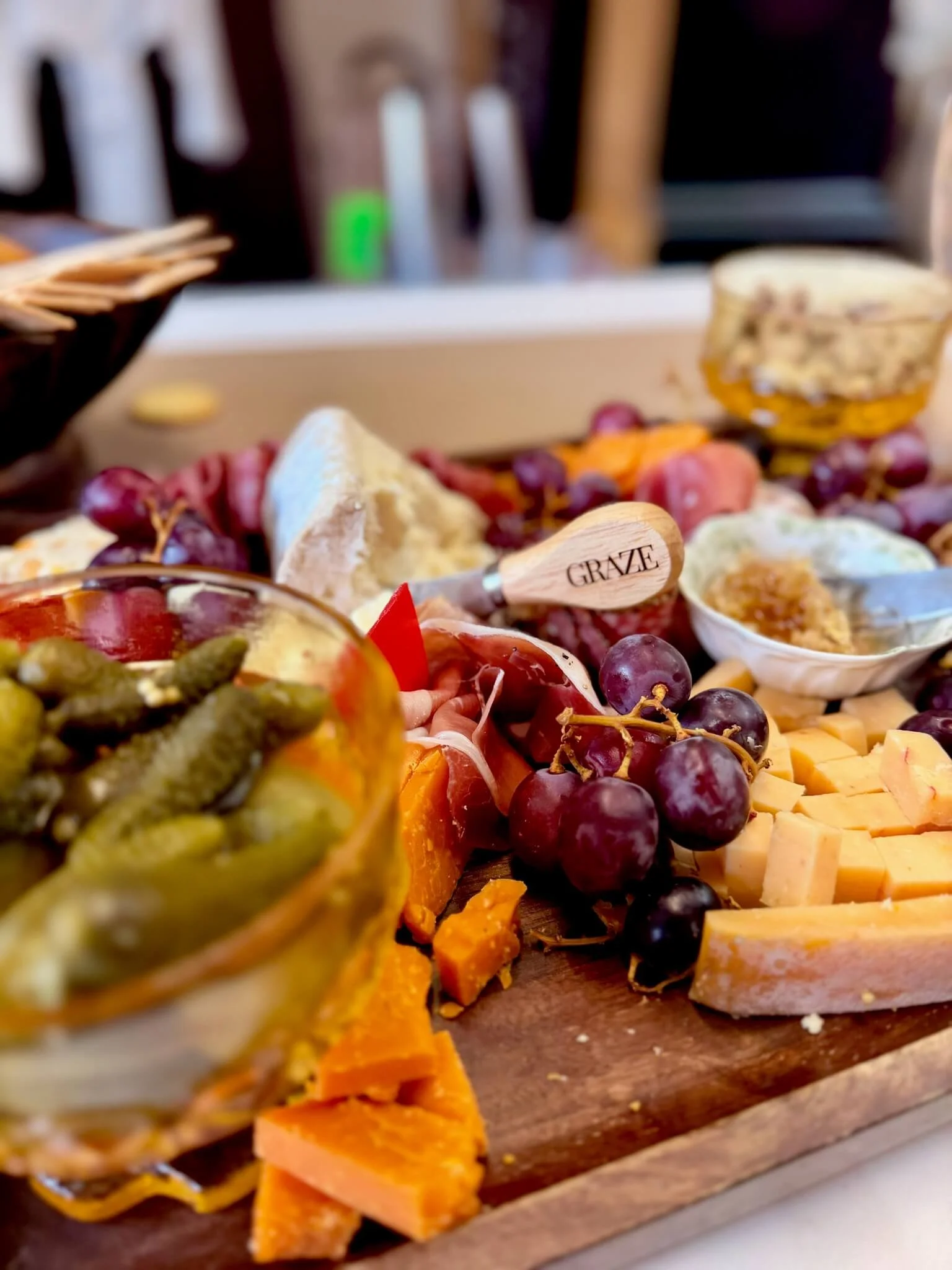 The charcuterie spread from Graze deserves its own moment. Kathleen, who owns and operates Graze, is truly an artist. The way she selects and pairs ingredients, cheeses that complement the crackers perfectly, salami rolled into the most beautiful little flowers, fruit and accents placed just so… it is as much visual as it is delicious. Her boards are always dependable, always stunning, and they have a way of making any event feel instantly elevated. The spread was the first thing guests gravitated toward when they walked in and it set the tone for the whole evening. If you are planning an event in the San Diego area, Kathleen is your person.