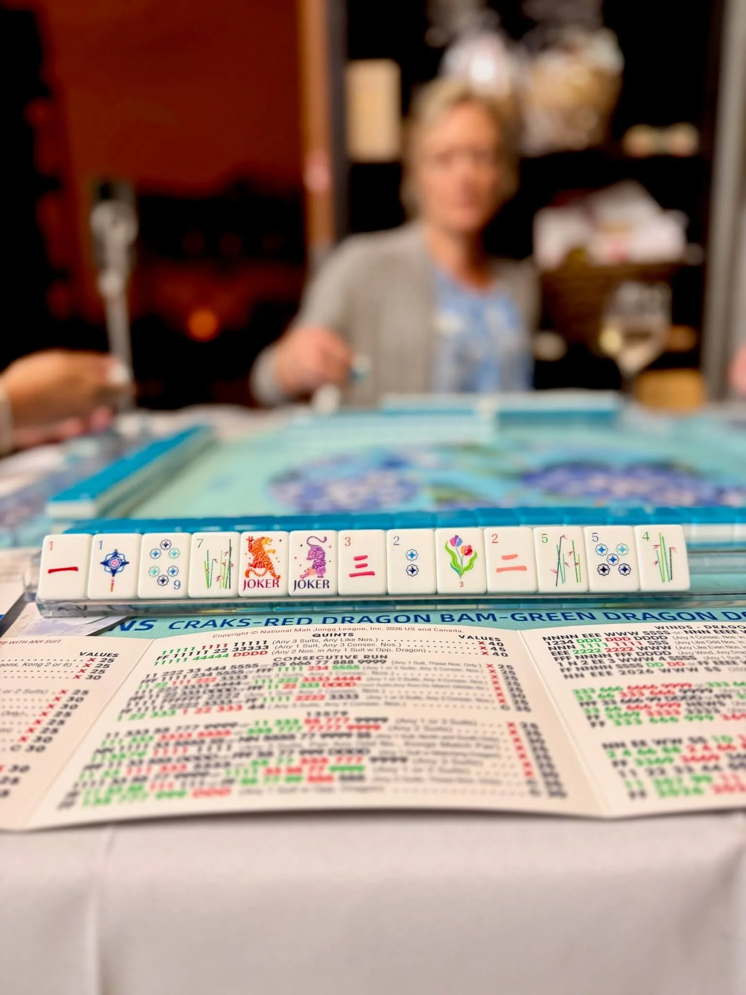 Each game is played with four players, 152 tiles, and one very important card, the 2026 National Mahjong League card. The card lists all the winning combinations for that year and is basically your cheat sheet and roadmap in one.
